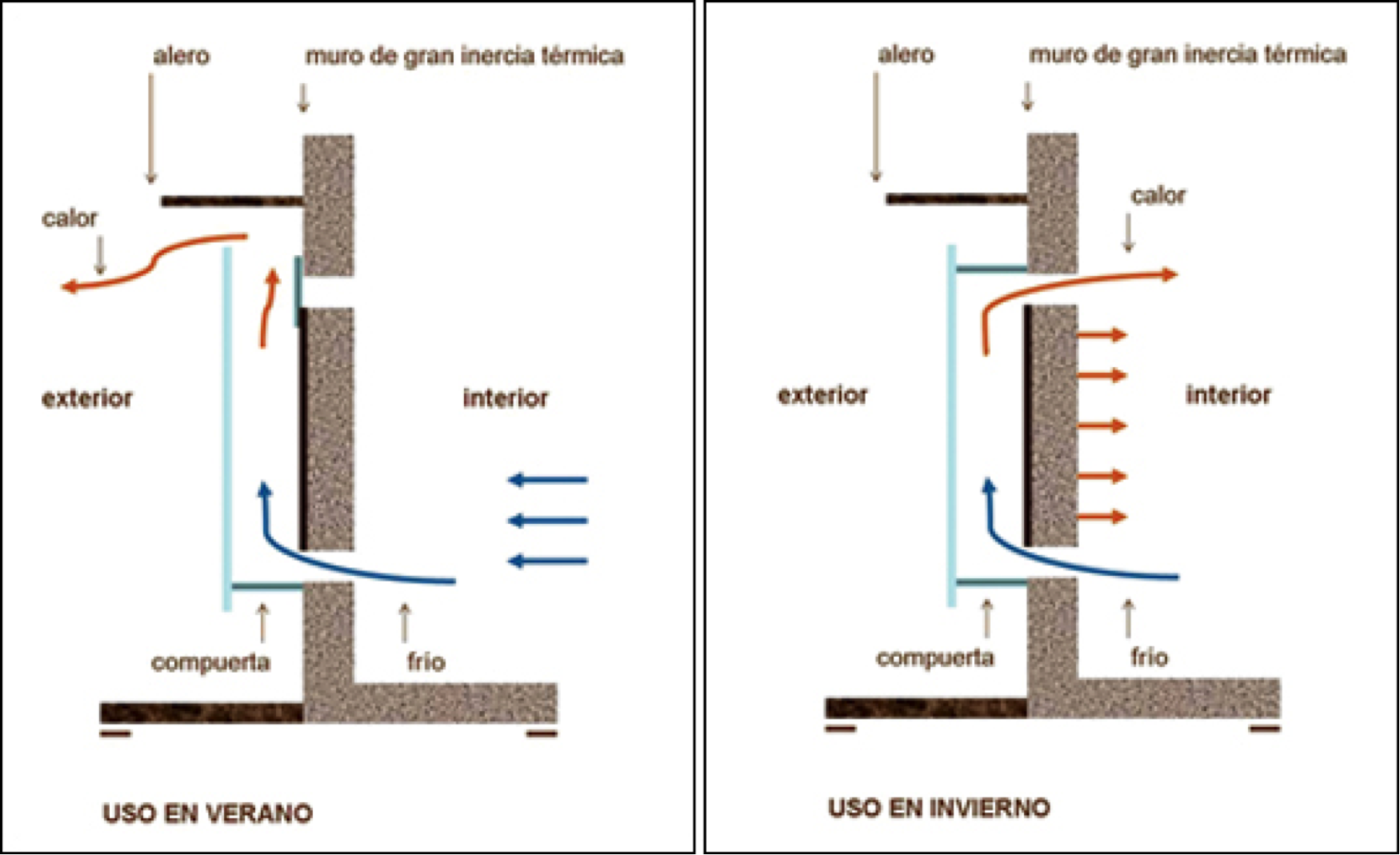 Imagen: Ejemplo de usos del muro trombe. Fuente: gstriatum.com