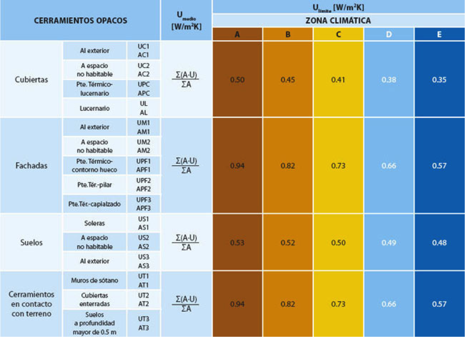 Por último, antes de analizar los materiales y las condiciones térmicas que deben tener las carpinterías, se adjunta una tabla resumen en la que vienen recogidas las exigencias según el Código Técnico para los principales cerramientos opacos de una edificación. Para la interpretación de la siguiente tabla se recomienda la consulta del siguiente apartado, en el caso de que pueda existir algún tipo de duda.