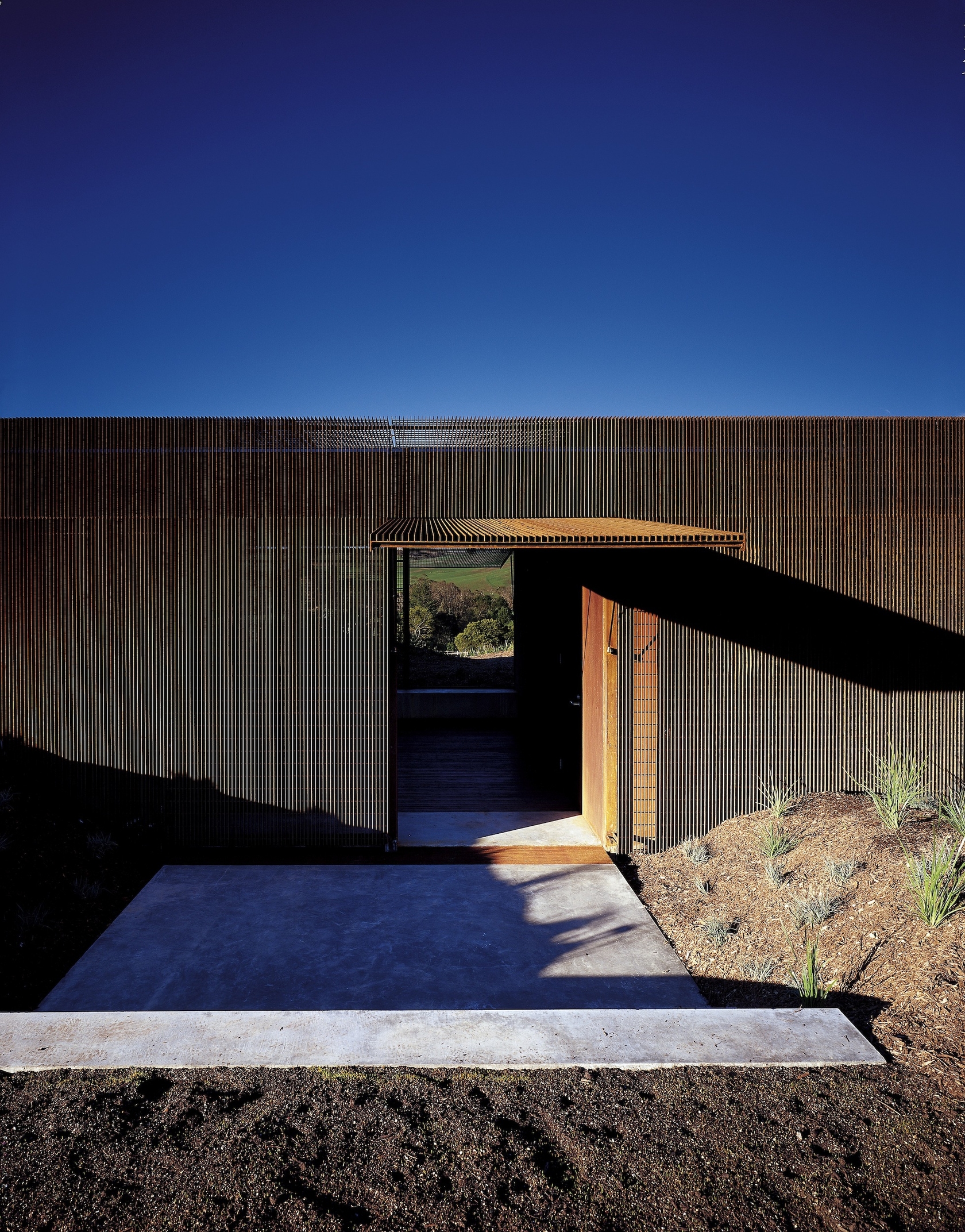 En ocasiones las viviendas adoptan el papel de refugios frente a las inclemencias del tiempo, una voluntad protectora que incide tanto en la orientación como en la construcción de pieles resistentes. Sean Godsell recubre con chapas de malla oxidada el preciso ortoedro que destaca sobre el australiano Valle Yarra.