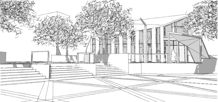 La geometría triangular de la plaza genera una serie de volúmenes que se elevan.
