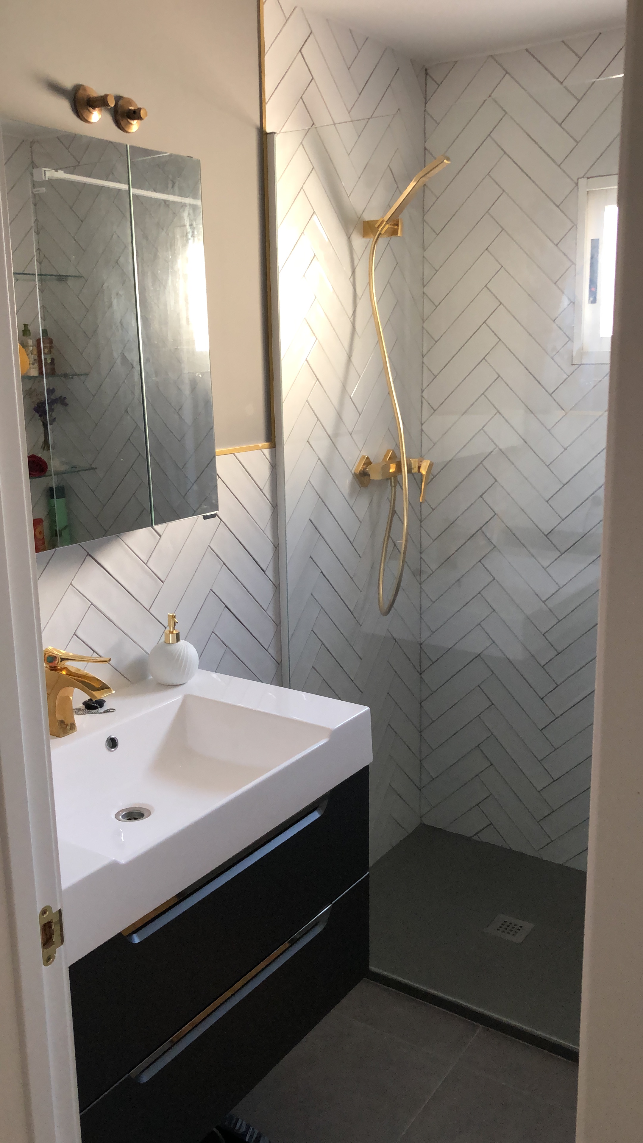 Baño con azulejos colocados en espiga, grifería dorada y mueble con sensor de movimiento e iluminación LED integrada.