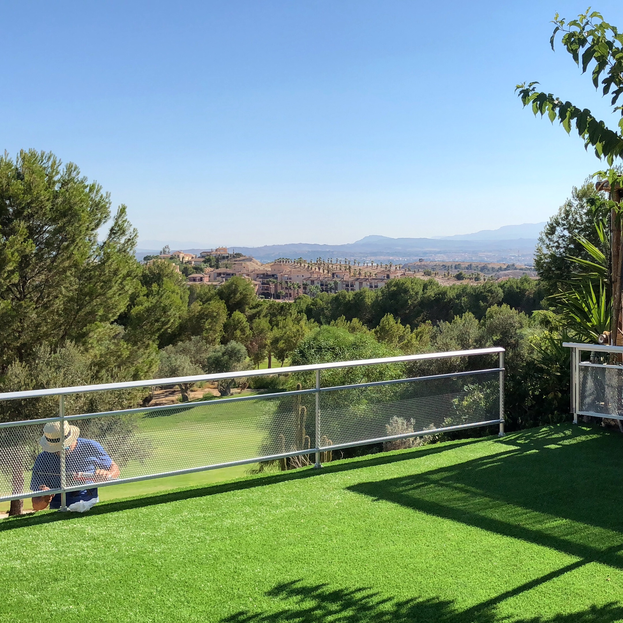 Cerramiento exterior de aluminio perforado anodizado y nivelación de suelo terminado en cesped artificial.