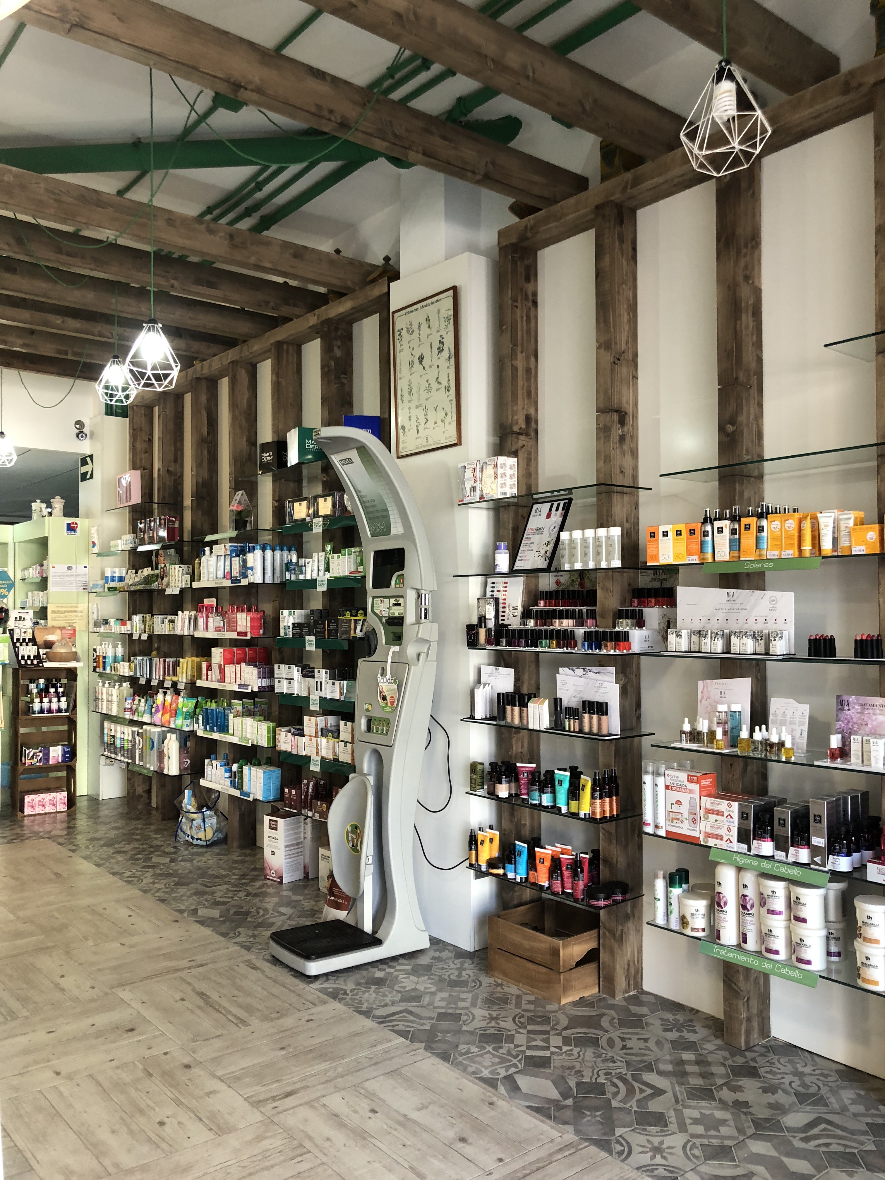 Zona de exposición de productos generada a partir de una sucesión de «falsas vigas» de madera tratada, los cristales a modo de estantería «flotante» generan un mobiliario flexible.